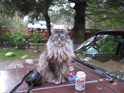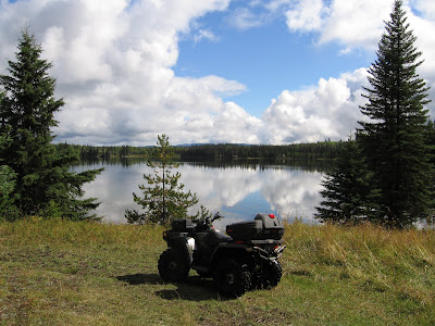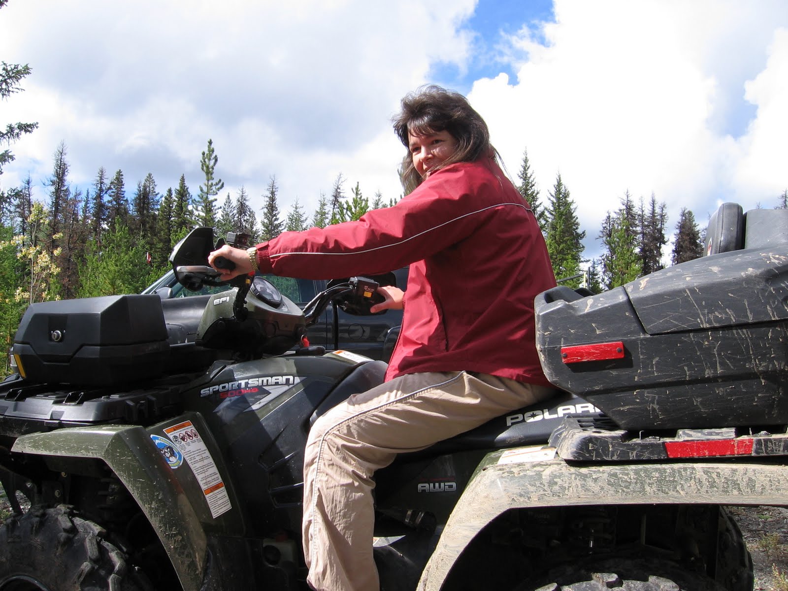 I returned with Brooke and took the bike out on the gravel road. Not my brightest idea but I got it up to 30 miles an hour (50 kmh), no helmet, riding on gravel and new to this. Dan says 'try the trails now' so off I go. We've had some rain so there are some serious puddles. Dan says just follow the tracks around them and put your foot on the fender to keep dry. Alright, I'll give this a try. Off I go, putting along. Around one puddle without a problem, second one down the trail a ways is a huge one. I see the tracks go around to the left so I follow. BIG puddle - it takes up the trail so my tires are going in. I lift my right foot to put it on the fender, hit my right arm with my knee which results in my thumb pressing harder on the accelerator. Instead of just letting go of the accelerator, I turn quickly to the right - through the puddle, find myself on the edge of the trail so turn quicly left and find myself on the other side of the trail - still moving fast. (zoom zoom) It took about eight seconds for the brain to click in that I should release the accelerator before I kill myself! At that point I decided it wasn't a good idea for me to be out alone in the bush riding this machine that has potential to seriously injure me. I got the bike turned around, maneuvered the puddlelake safely and went back to the trailer. Despite this small mishap, I still want my own ATV - just a little smaller and less powerful than the one Dan rides.