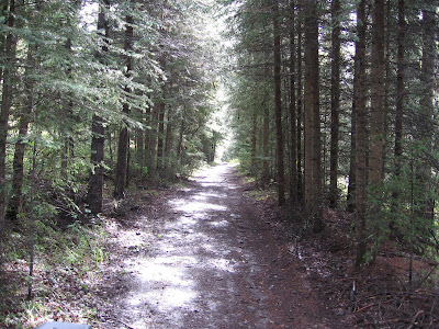 As I wrote earlier, I had my five second lesson on riding and Dan suggested I take the bike out on the trails. He gave me directions: follow the trail, at the fork keep left, if you go right . . . . , put your foot on the fender if you're going through a puddle. Well, I better just try this thing out before I venture in the bush and get myself lost.