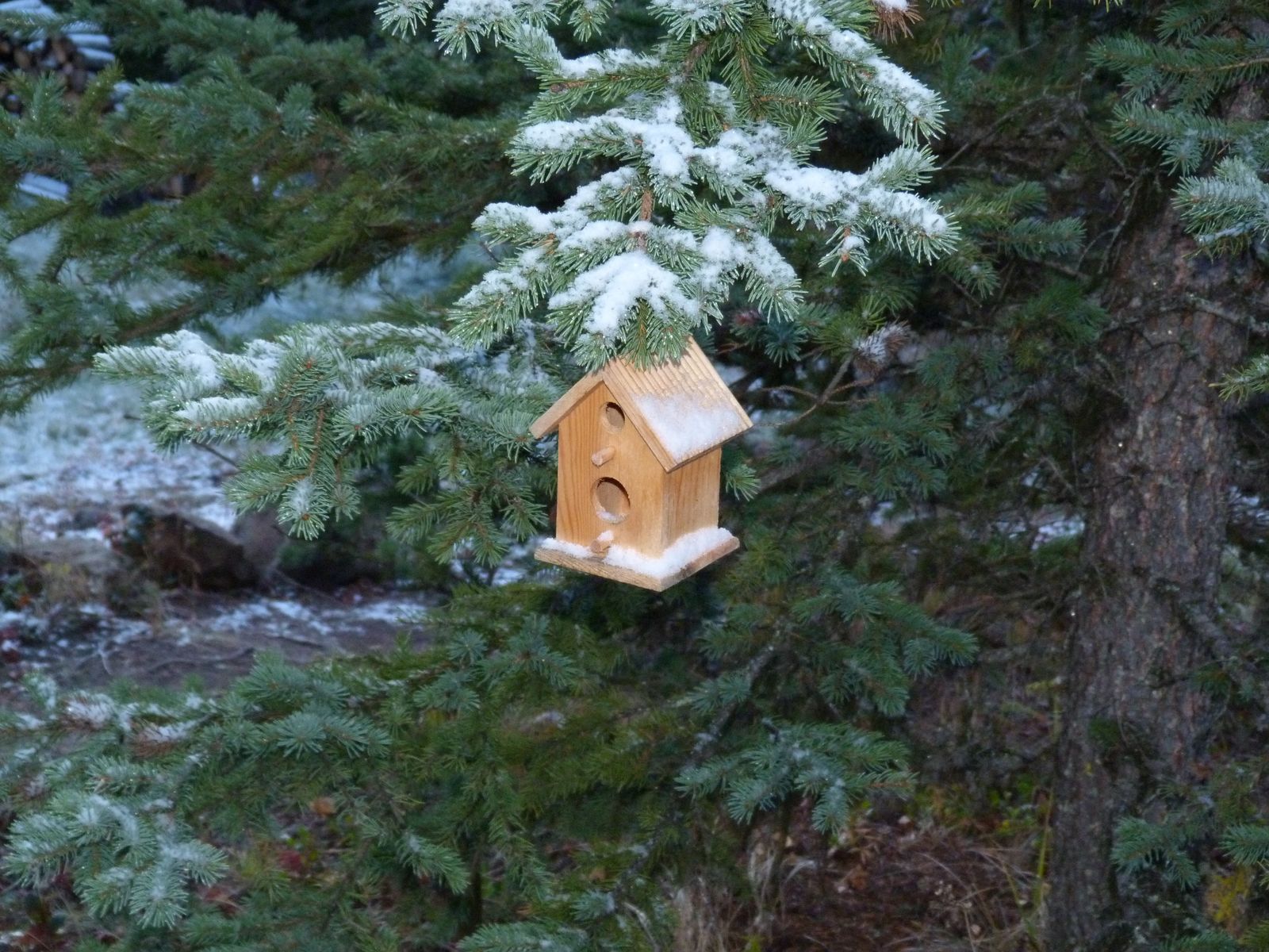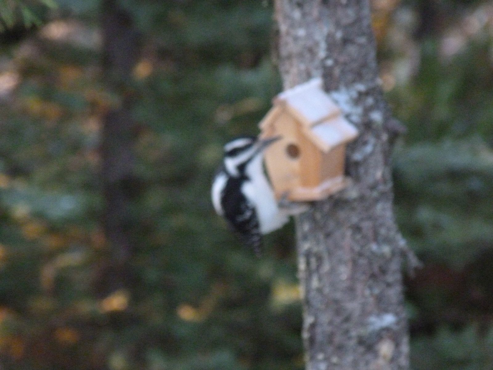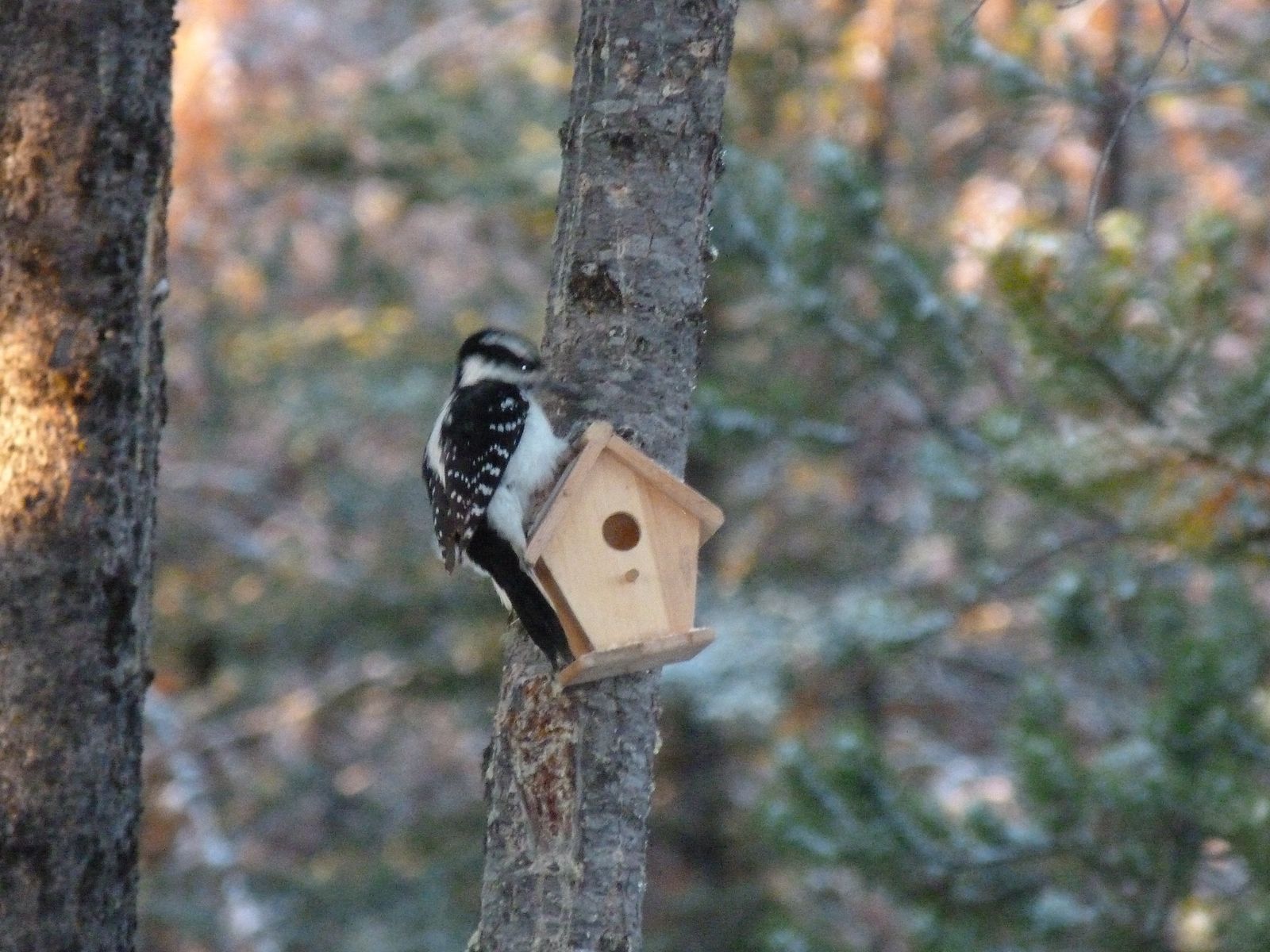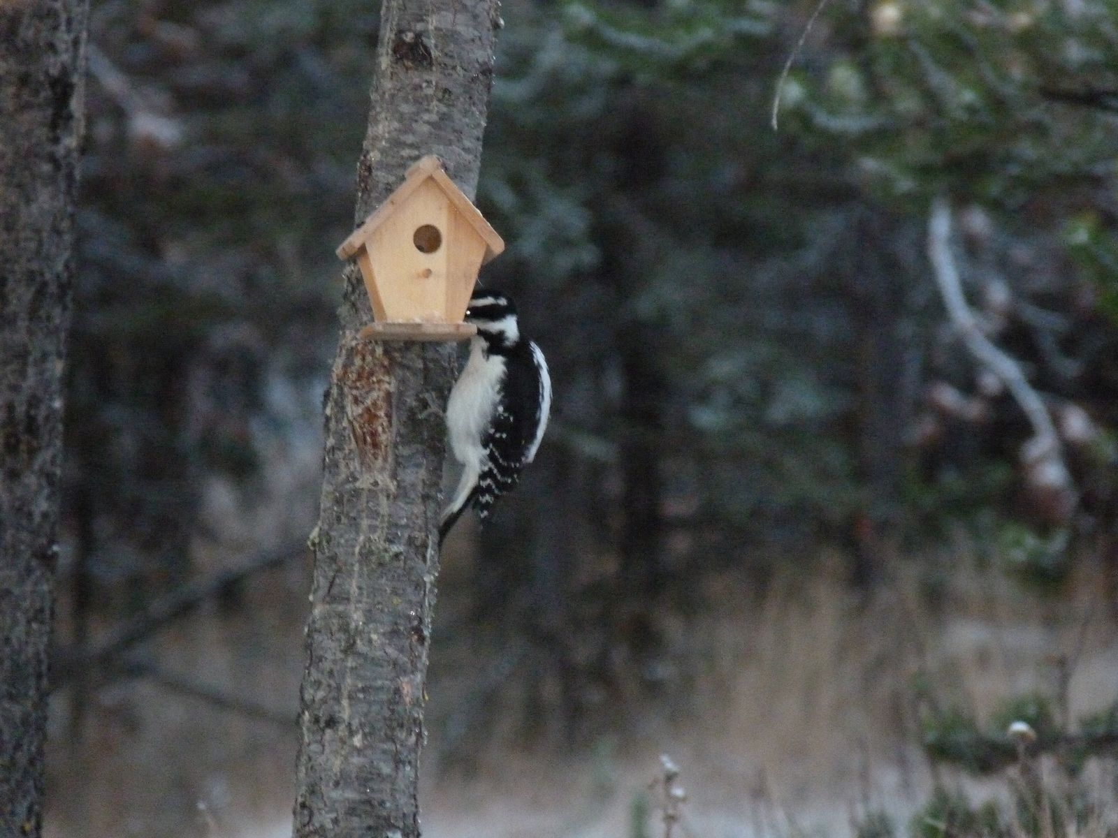 Sorry charlie, the houses are decoration only. We will be providing accommodations at some point that are sufficient for their purposes. All in good time though. I need time to research the black and white woodpecker (and the grey jay which you will see pictures of soon) to see what they prefer for accommodation.