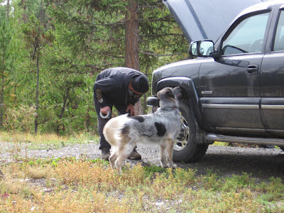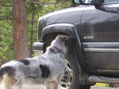 I mentioned the 'squatters' in a picture a few posts ago. Brooke is constantly on full alert, watching for the little buggers to get too close. Well, they have taken to using the truck as a 'safe' zone where Brooke can't get at them. Then they started stealing some insulation from under the hood. Dan and Brooke decided to check it out.