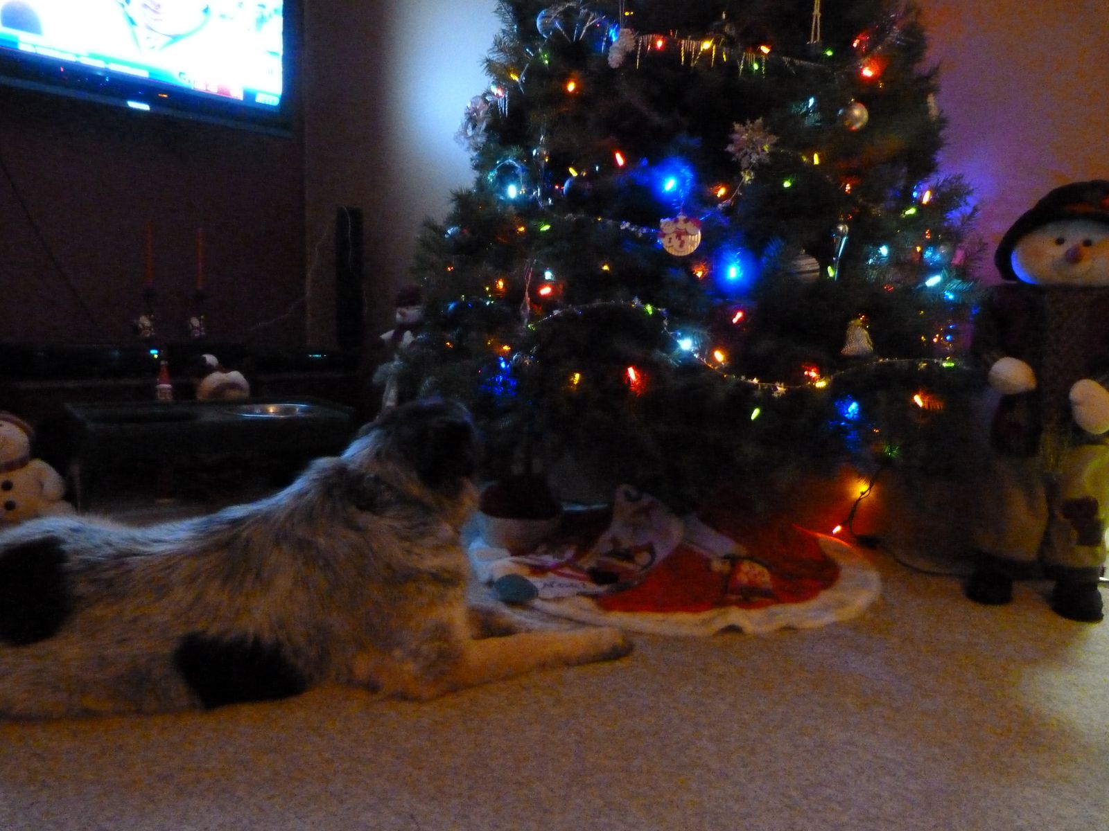 While in the house, both cat and dog spent a great deal of time as close to, or under, the tree as possible.