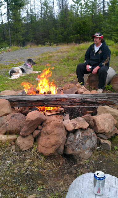 One evening after we quit work on the skirting for the trailer, we had a fire in the firepit. Dan was relaxing and Brooke was making sure no wiley chipmunks were getting close: