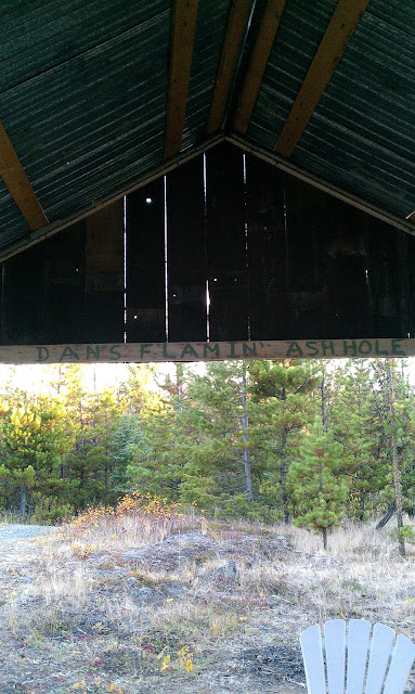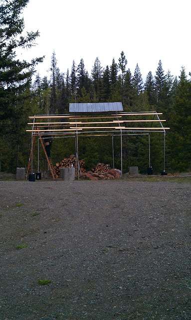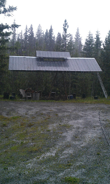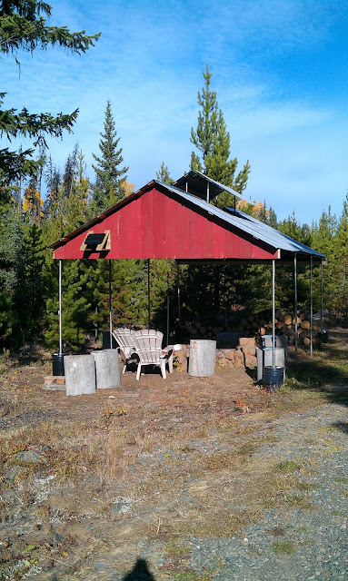 The roof over the fire pit was a must as we spend nearly every waking minute outside when we are up there. Here's what we started with and please note the weather in this picture - it is NOT raining.