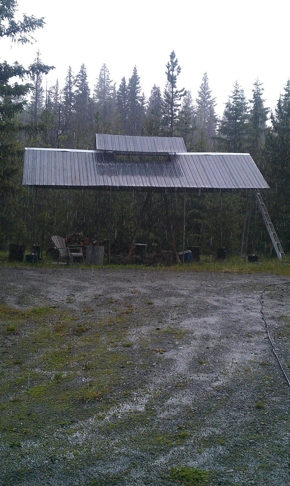 All in the pouring rain! What really sucked about the whole job is not the fact that it stopped raining shortly after the work was done. No, not at all. The worst part was that I was the "helper". As a helper, I stood out in the rain holding each roof panel up while Dan worked underneath screwing around the whole thing together. He was pretty much dry at the end of the job. I, on the other hand, was soaking wet. You see, the plan required me stand below the panel and hold it up on the frame until a few screws were installed. Sounds like fun right? Well, I guess so, if you like the feeling of a river running down your arms, to your arms pits and then down your torso. Go ahead, put your arms up in the air slightly in front of you and pretend you are holding a metal sheet with a river running down it. You get the idea now don't you!