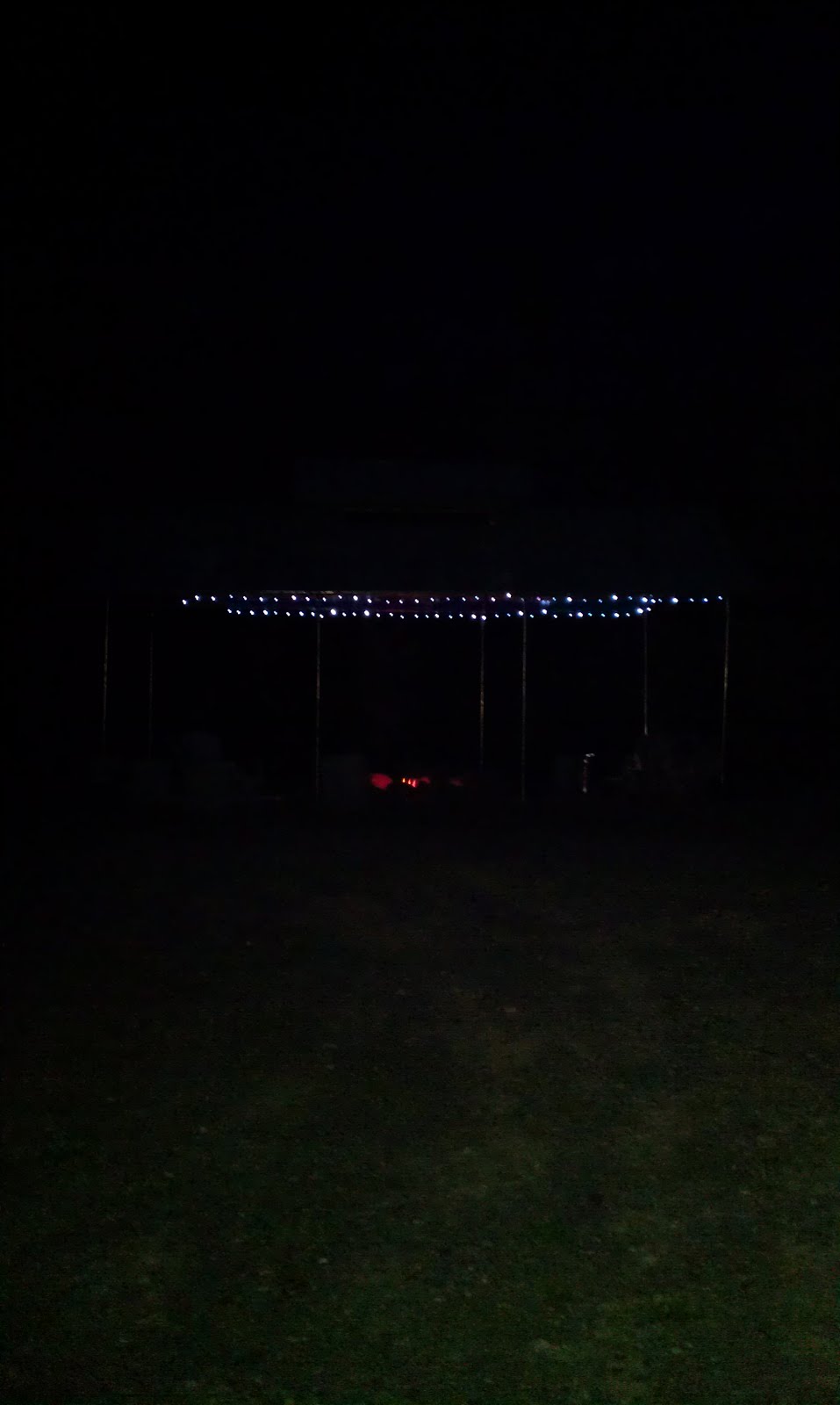 We recycled old fence panels from our house on the coast. The black panel on the left is what made me 'glad'. I went out and bought a string of solar lights to go around (most of) the frame and that is the solar panel. Now not only do we having a roof over our head so we can enjoy a fire in the rain, we also have mood lighting.